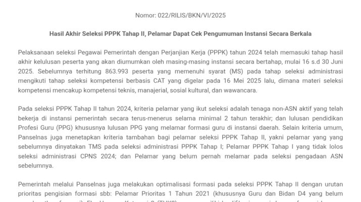 Jakarta, 17 Juni 2025 – Badan Kepegawaian Negara (BKN) mengumumkan bahwa proses seleksi Pegawai Pemerintah dengan Perjanjian Kerja (PPPK) Tahun 2024 telah memasuki tahap akhir pengumuman hasil kelulusan peserta. Pengumuman hasil akhir ini akan disampaikan oleh masing-masing instansi secara bertahap mulai tanggal 16 hingga 30 Juni 2025.