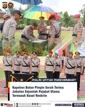 BUTON – Kapolres Buton, AKBP Ali Rais Ndraha, S.H., S.I.K., M.M.Tr, memimpin langsung upacara Serah Terima Jabatan (Sertijab) sejumlah Pejabat Utama (PJU) Polres Buton