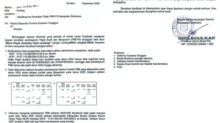 Bombana β PPID Utama Kabupaten Bombana menanggapi beredarnya informasi di media sosial terkait dugaan lonjakan pembayaran Pajak Bumi dan Bangunan Perdesaan dan Perkotaan (PBB-P2)