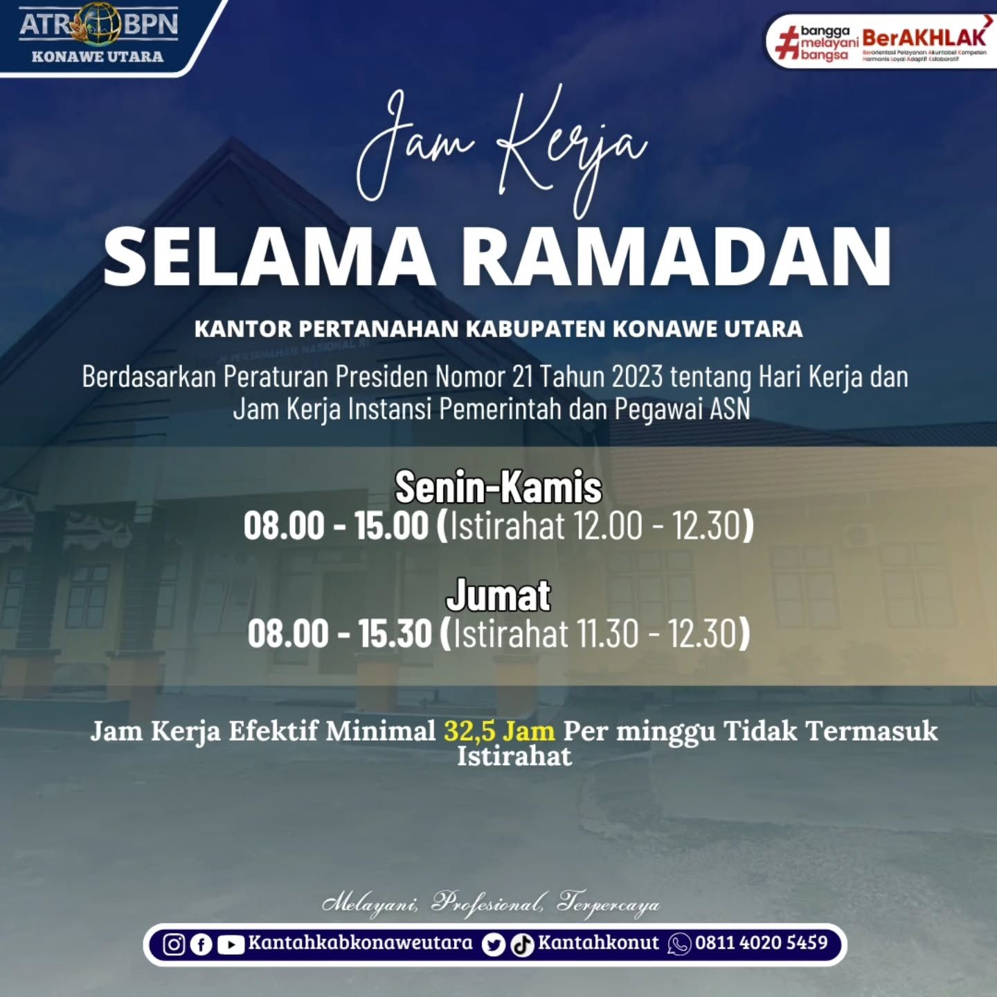 Halo #SobATRBPN, KonutDalam rangka menjalankan ibadah puasa Ramadan 1446 H, Pemerintah telah menetapkan jam kerja bagi para Aparatur Sipil Negara sebagai upaya untuk menjaga pelayanan