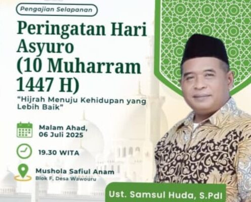 Konawe Selatan, 6 Juli 2025 – Dalam rangka memperingati Hari Asyuro (10 Muharram 1447 H), masyarakat Desa Mekarsari dan Desa Wawouru, Kecamatan Palangga, Kabupaten Konawe Selatan menggelar pengajian selapanan bertema “Hijrah Menuju Kehidupan yang Lebih Baik”, pada Ahad malam, 6 Juli 2025.