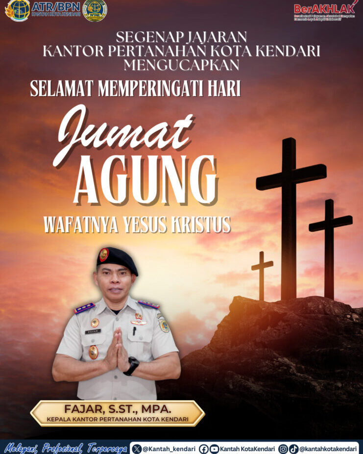 Segenap jajaran Kantor Pertanahan Kota Kendari mengucapkan Selamat Memperingati Hari Jumat Agung 2025 Wafatnya Yesus Kristus .