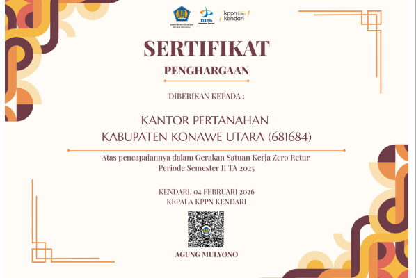 Konawe Utara – Kantor Pertanahan Kabupaten Konawe Utara menerima penghargaan dari Kantor Pelayanan Perbendaharaan Negara (KPPN) Kendari sebagai bentuk apresiasi atas kinerja dan kepatuhan