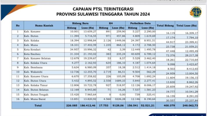 Kantor Pertanahan Se-Sulawesi Tenggara Catat Capaian Gemilang PTSL Terintegrasi 2024: Total 400 Ribu Bidang dan 248 Ribu Hektare Tersertifikasi