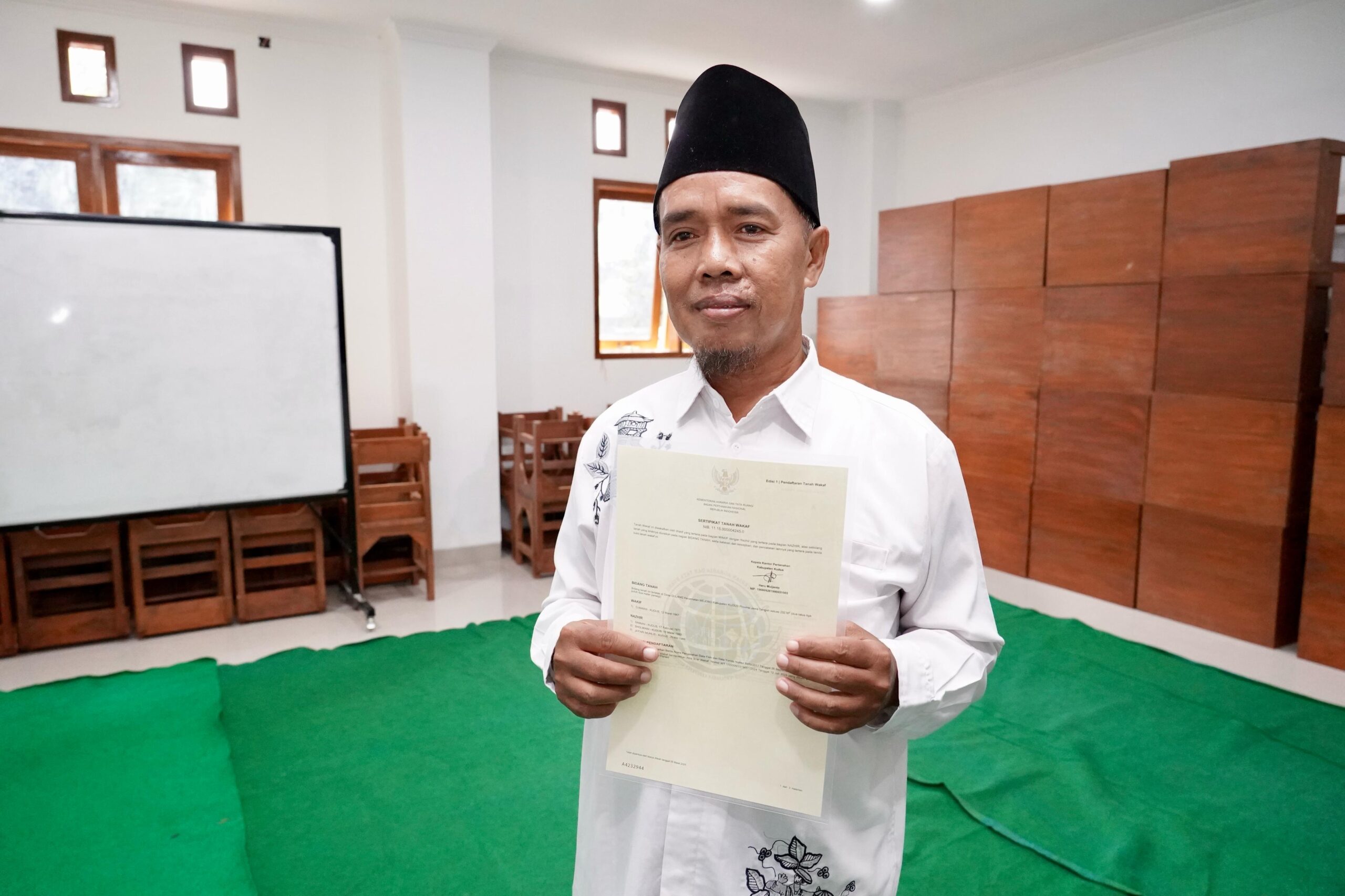 Kudus — Penyertipikatan tanah adalah hal penting yang kian hari semakin disadari oleh masyarakat Indonesia. Salah satunya Saiman, laki-laki kelahiran Kabupaten Kudus, yang pada Sabtu (08/03/2025) baru saja menerima sertipikat tanah wakaf dengan peruntukkan Makam Demangan. Ia berpendapat, penyertipikatan tanah wakaf penting agar tanah yang dikelola untuk kepentingan umat tidak disalahgunakan oleh pihak tak bertanggung jawab di waktu mendatang.